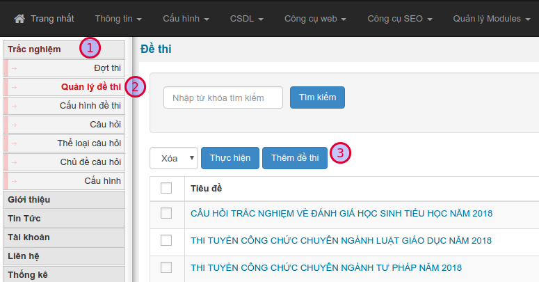 Từ giao diện chính, truy cập menu Trắc nghiệm (1) / Đề thi (2) / Thêm đề thi (3)