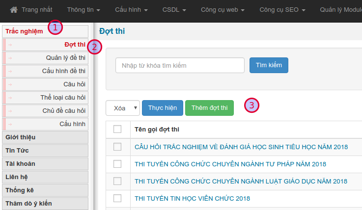 Từ giao diện chính, truy cập menu Trắc nghiệm (1) / Đợt thi (2) / Thêm đợt thi (3)