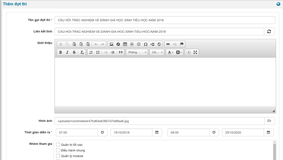 | Giới thiệu | Nhập nội dung giới thiệu đợt thi. Nội dung này sẽ hiển thị khi bắt đầu làm bài |