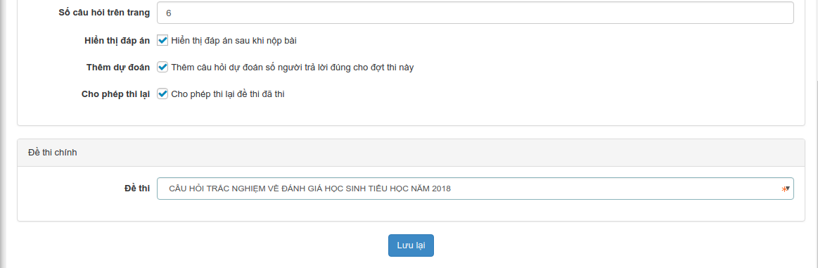 | Cho phép thi lại | Cho phép người thi làm lại bài thi trong thời gian diễn ra thi. Hệ thống sẽ ghi lại kết quả thi cao nhất |