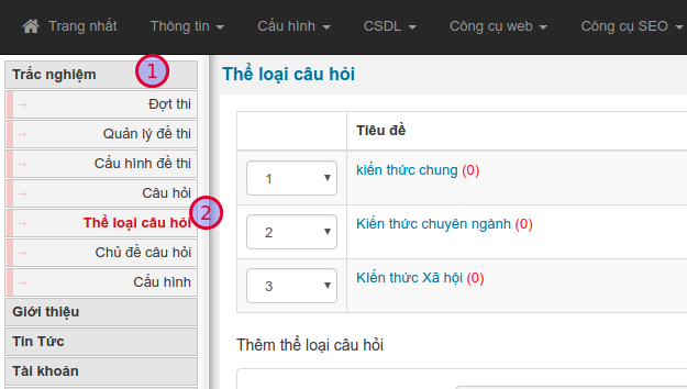 2. Quản lý thể loại câu hỏi